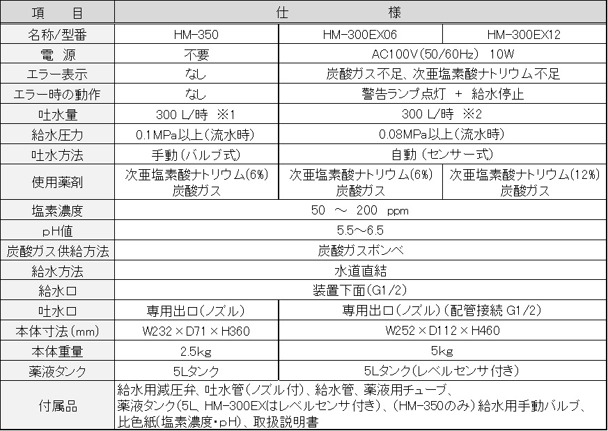 使用する次亜塩素酸ソーダの濃度に合わせて2種類のラインナップ(6%用:HM-300EX06/12%用:HM-300EX12)があります。